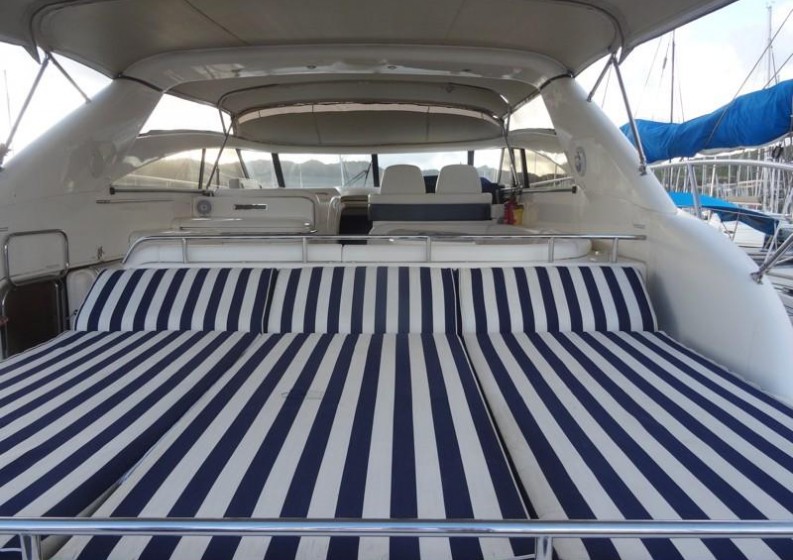 * Self-draining * U-shaped seating/dining area * Cockpit wet bar with refrigerator, barbecue and icemaker * Sunbed aft * Dinghy stowage garage beneath sunbed, with hydraulic lift system * Electric winch dinghy retrieval system * Optional telescopic passearelle * Fender stowage * Life raft storage * Access hatch to lazarette stowage space with gas strut support * Access hatch to engine room with gas strut support * 220/240v shore support inlet in locker * Stowage lockers * Folding hood forward (can extend as sun canopy or complete enclosure), sun awning with side screens aft * Overall tonneau cover * Stainless-steel grabrails * Radar arch * Cockpit lighting * Transom door leading to integral bathing platform with hot and cold transom shower, foldaway swimming ladder and teak decking. Optional sunroof GRP sunroof with opening fabric centre section (electrically operated), removable side windows, tonneau cover aft with zip door.